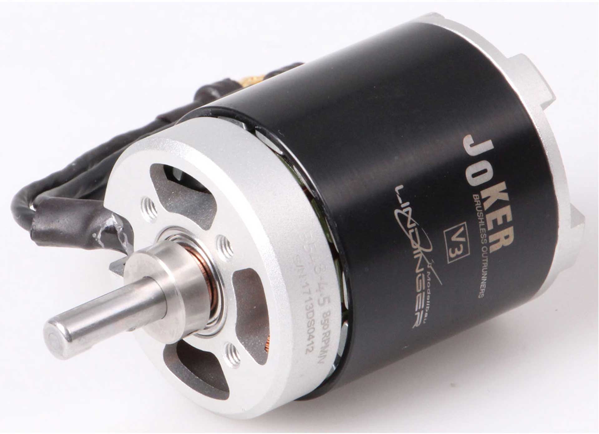 Die Außenläufer in der Version V3 bieten noch mehr Leistung, bei gleichzeitig geringerer Wärmeentwicklung und somit besserem Wirkungsgrad. Es werden hochwertige japanische Kugellager und 0,2 mm Statorbleche verwendet. Die Elektromotoren der Serie "Joker" werden gern in Segelflugmodellen und Motorflugmodellen eingesetzt. Die Rückwandbefestigung, der Propellermitnehmer, Steckverbinder und Schrauben sowie eine deutsche Bedienungsanleitung sind im Lieferumfang enthalten.